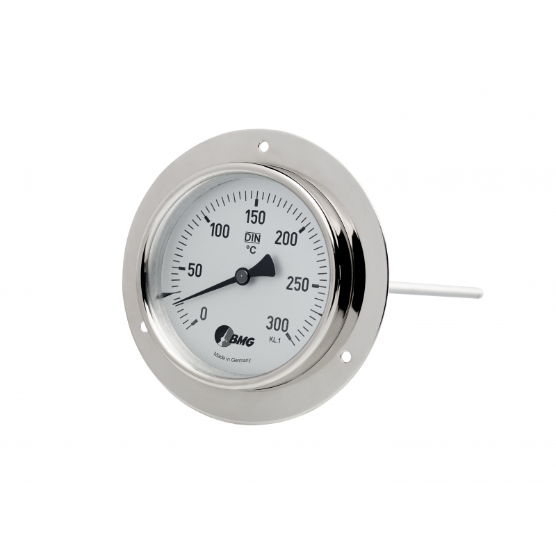 Luftkanalthermometermit Befestigungsrand in Edelstahl.